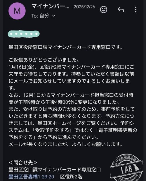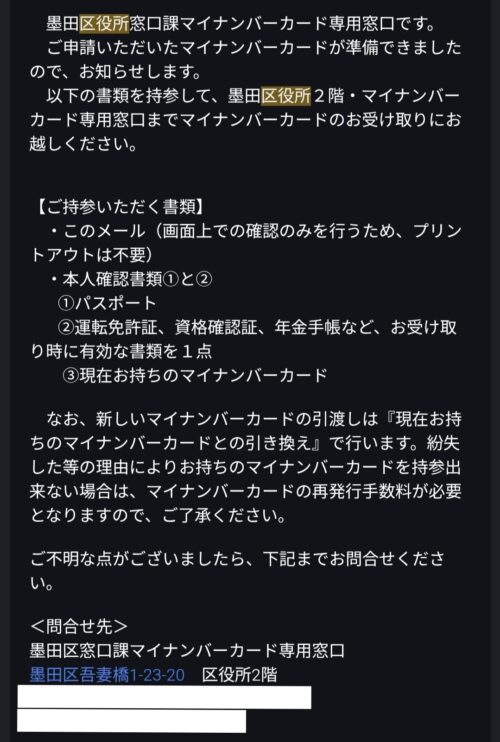 墨田区役所からマイナンバーカードが準備できたとメールが届きました。