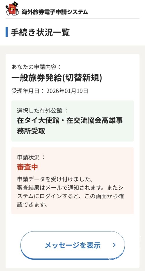 「審査中」→「発行手続き中」→「大使館で受け取り可能」のようにステータスが変わるかと思ってましたが違うようです。